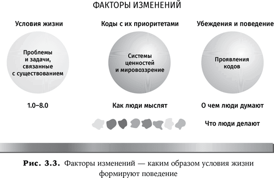 Из рис. 3.3 следует, что условиям жизни, которые создают проблемы и ставят под вопрос само существование, соответствует определенный образ мышления людей и основные коды, которые воплощаются в поведении. Есть разные системы ценностей, разное мировоззрение и разные коды. Взаимодействие внешних условий жизни и внутренних приоритетных кодов определяет то, что люди думают и что они делают. А уже потом мы замечаем видимые проявления приоритетных кодов в поведении индивидуумов, групп и общества.
