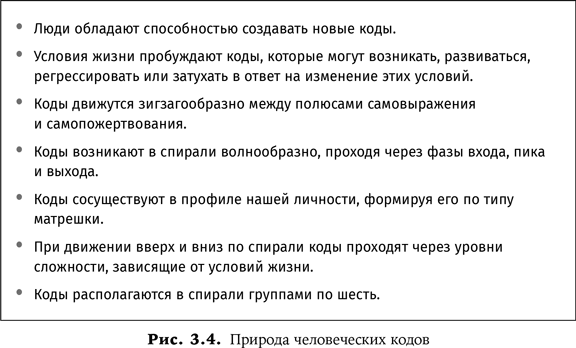 Отливы и приливы в изменениях кодовОднако мы не всегда легко движемся вперед в направлении более сложного мышления. Обстоятельства могут увести нас по спирали вниз или вверх по уровням сложности. Стрессовые условия жизни могут вернуть нас к предыдущему коду. Когда два самолета разрушили Всемирный торговый центр в Нью-Йорке, шокированные и потрясенные горем граждане слились в едином патриотическом порыве, которого Америка не видели со времен атаки японцами Перл-Харбора 7 декабря 1941 г. Исчезли статьи о глобализации экономики. Народ выступил с требованием найти сильного лидера, который спас бы американский образ жизни. Яростно противостоящие друг другу в конгрессе демократы и республиканцы плечом к плечу стояли на ступенях Капитолия и вместе пели «Боже, благослови Америку» – этот глубоко символический жест всего несколько дней назад было невозможно даже представить себе. На рис. 3.4 описывается природа человеческих кодов.