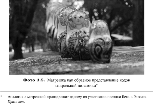 Представьте себе матрешку. Откройте ее, и внутри окажется следующая, поменьше. А в ней найдете еще одну, и еще, и каждая будет меньше предыдущей. Точно так же характеристики кода по-прежнему встроены в наше сознание даже после того, как в нашем мышлении начинает доминировать новый код. Так, БЕЖЕВЫЙ остается внутри ФИОЛЕТОВОГО, который скрывается внутри КРАСНОГО, по-прежнему находящегося внутри СИНЕГО, а он хранится внутри ОРАНЖЕВОГО, присутствующего внутри ЗЕЛЕНОГО, и так далее.