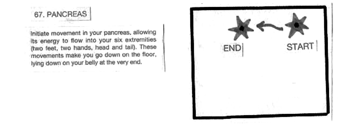 Этот автокомментарий следует рассматривать прежде всего как типичный пример дискурса автоэффективности, достигаемой посредством соматических практик. Однако поскольку для танцовщиков, как, например, для группы «Dance (praticable)», речь идет не только о тренировках или процессах самоизлечения, но прежде всего о нахождении в соматических практиках новых форм движения, его инициирования и передачи, то здесь возникает вопрос: как это вообще возможно? Как это выглядит? И какие приемы для этого используются? Фредерик Гис, описывая одну из задач его работы в «Dance (praticable)», говорит о том, что она состояла в том, чтобы «несколько секунд удерживать позицию, кристаллизующую эндокринную железу»140. Для своих задач он разработал партитуру, благодаря которой такие органы, как селезенка или легкие, а также кости, но прежде всего жидкости (кровь, лимфа) и железы становятся центрами и отправными точками для движения.