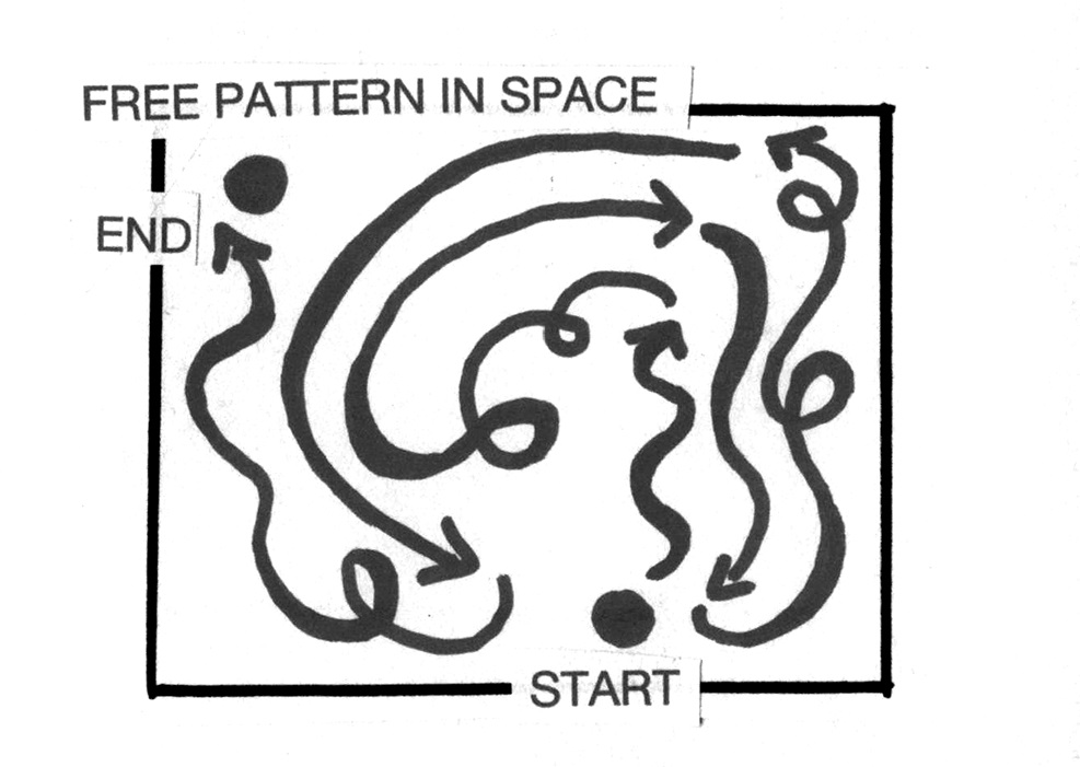 Дыхание/Грудобрюшная преграда/ДиафрагмаВ центральном фокусе соматических практик, относящемся к синхронизации движений, ритмической работе и работе с энергией, находится дыхание, солнечное сплетение (и легкие). В «Dance (praticable)» Фредерика Гиса важна также следующая сцена: оживленное движение, «свободная схема движения в пространстве» [ил. 3], сплетенная, извивающаяся, сопровождаемая указанием: