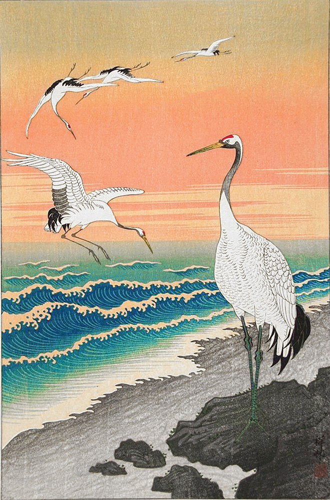 На третий день вынесла о-Цуру к старикам сверток узорчатой ткани. По красному полю золотые журавли летят.