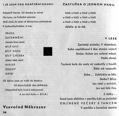 Всеволоду Некрасову и «его кругу» в новом журнале, который вскоре стал трибуной интеллектуалов, критически настроенных против правивших властей и отстаивающих, вопреки цензуре, право на неидеологическую литературу, был посвящен один разворот – две страницы квадратного формата, с черным квадратиком почти посередине первой из них. Вокруг этого слегка сдвинутого центра располагались три стихотворения, остальные два, контрастно оформленные (одно напечатано заметно увеличенными буквами, другое, наоборот, уменьшенными), размешались на второй странице, рядом с заметкой, озаглавленной «Uvedení do Vsevoloda Někrasova» («Введение в Всеволода Некрасова»). В ней Броусек знакомил чешских читателей с автором только что прочитанных ими стихов и представлял им как можно шире контекст его творчества. Начинал он издалека, с объяснения возможной путаницы в русских писателях, носивших фамилию Некрасов: