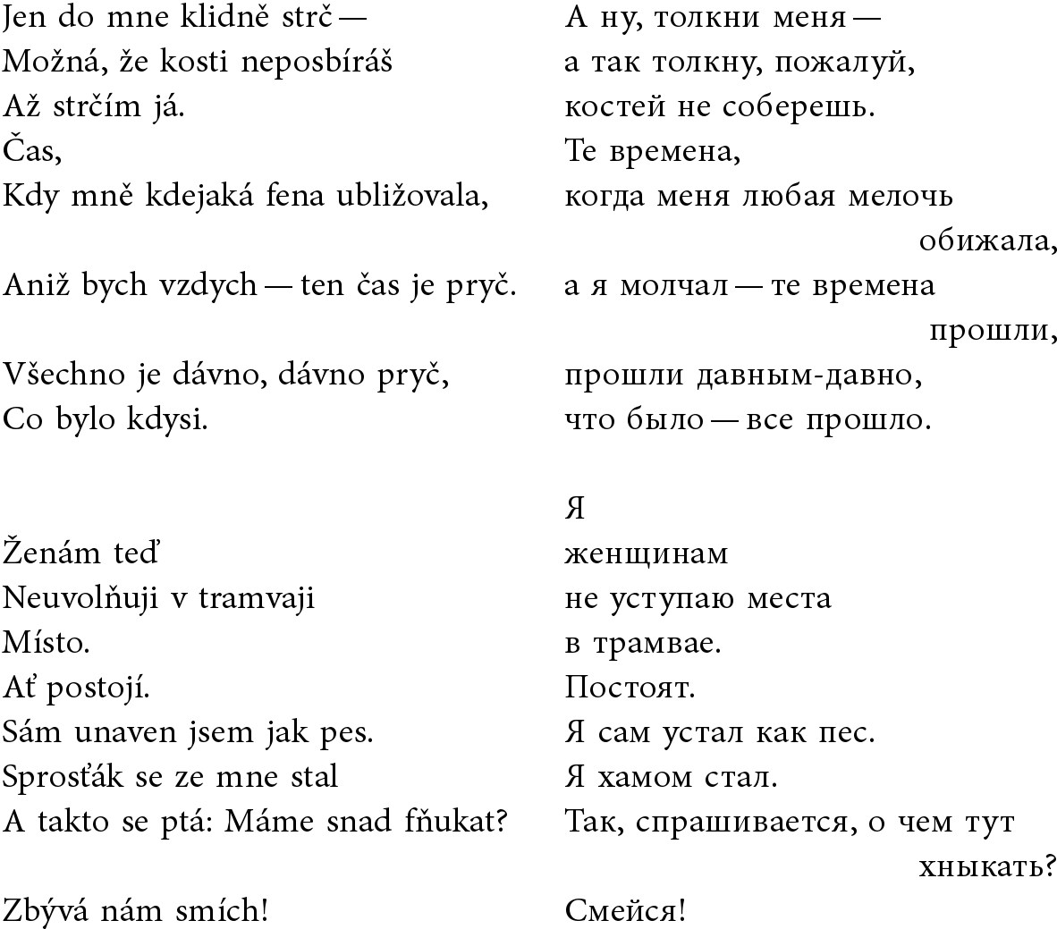 Это стихотворение в переводе Броусека было снова опубликовано 6 апреля 1966 года на страницах четырнадцатого номера еженедельной газеты Чехословацкого союза молодежи «Студент» (Student)140. Публикация на этот раз была посвящена не только Некрасову, и, может быть, именно поэтому начало этого «программного» стихотворения оказалось слегка измененным. Вместо «TY? / JÁ… / VY? / MY!» здесь стояло «Já? / Ty! / My? / Vy!». Местоимения поменялись местами, акценты расставлены по-другому – упор делается уже не на «я/мы» – те вдруг оказались под вопросом, а на других – «ты/вы».