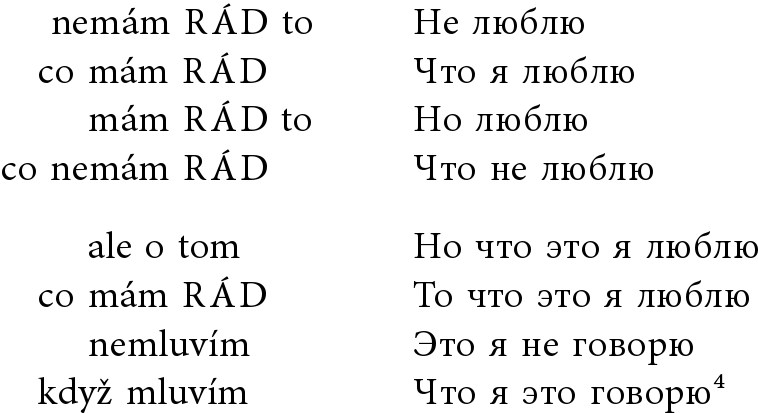 Большими буквами выделенное, в столбик выровненное, повторяющееся имя прилагательное „RÁD“, которое в сочетании с глаголом „mám/nemám“ значит «я люблю / я не люблю», притягивает именно взгляд читателя и как будто не дает ему потеряться в этой немногословной путанице135.