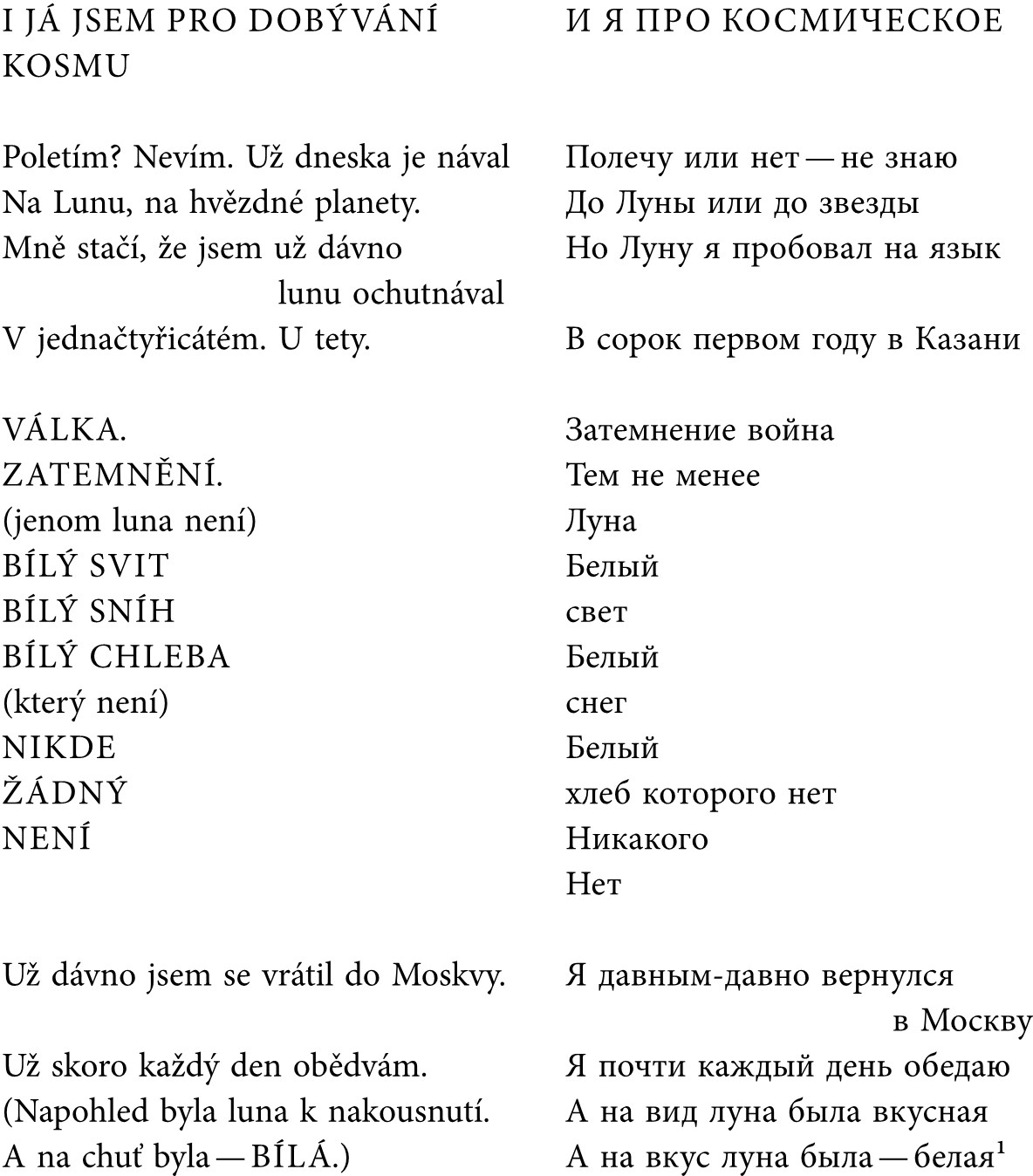 При сравнении перевода с оригиналом, даже если не вчитываться, в глаза бросается обилие непоследовательно размещенных знаков препинания в первом131, и то, что Броусек в переводе по сравнению с Некрасовым несколько многословнее. Стараясь понять, Броусек договаривает многое из того, что в оригинале остается умышленно недоговоренным. Стремясь сохранить рифму, он добавляет в оригинале не существующие смыслы – как например, в первой строке, где за простым вопросом и ответом «Poletím? Nevím» (Полечу или нет – не знаю) в переводе следует еще и дополнительное объяснение «Už dneska je nával» (Уже сегодня масса желающих), не находящее в оригинале поддержки. Оно необходимо ради рифмы с третьей строкой «Mně stačí, že jsem už dávno lunu ochutnával», которая представляет весьма вольную, «говорливую» интерпретацию оригинала (Мне достаточно того, что Луну я давно пробовал на язык). И на том же основании из стихотворения выпадает город Казань, в котором Некрасов находился вместе с родителями в эвакуации132, и вместо этого он в переводе оказывается «U tety» (У тети). И, наверно, опять в связи с желанием переводчика сохранить рифму, в стихотворении Некрасова на чешском утверждается, что луны нет: «ZATEMNĚNÍ. / (jenom luna není)», хотя она как раз, единственная, несмотря на все, на войну и голод, есть.