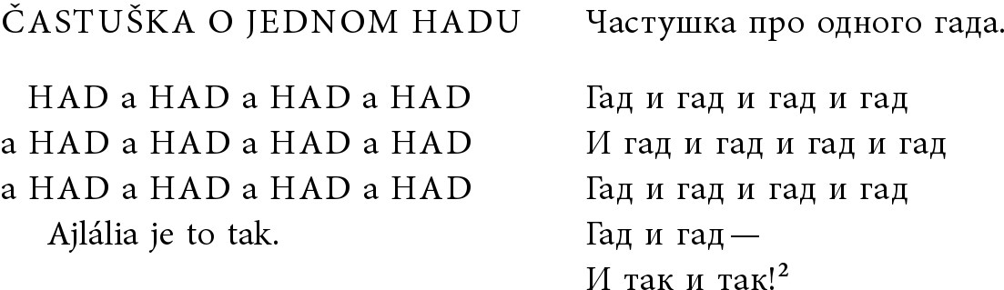 Стихотворение про одного гада – т. е. про мерзкого, отвратительного человека. Однако в переводе это значение уходит на второй план. Читатель словно змея (а именно это первичное значение чешского слова „HAD“, которое в переносном смысле можно воспринимать также как бранное слово, обозначающее коварного человека) загипнотизирован повтором, и убеждается в том, что «…многократный повтор неизбежно выводит в визуальность»134. Именно на визуальность делает акцент перевод и его типографическое решение в ущерб значению – как и в случае стихотворения напечатанного мелким шрифтом в нижней части следующей страницы: