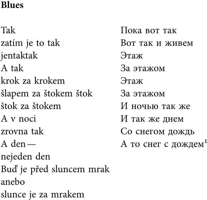 Из поэтов в газете «Студент» были представлены только два – естественно, проводник Веверки Некрасов, и вместе с ним Ян Сатуновский. Первый в переводах Броусека, второй в переводе Веверки. Помимо уже печатавшегося стихотворения Некрасова «Все ясно с местоимениями» в газете опубликовано еще одно – озаглавленное словом «Blues» («Блюз»).