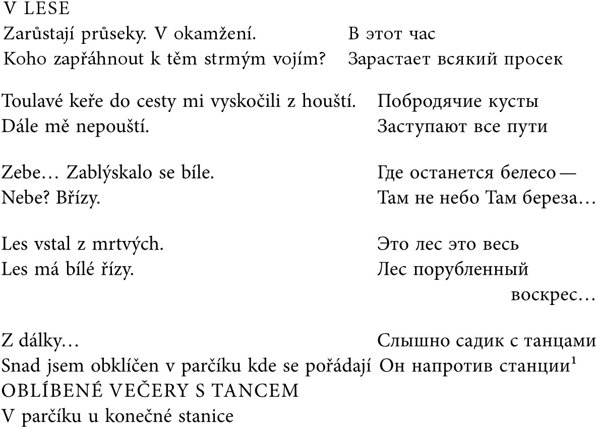 Чешский вариант озаглавлен – «V LESE» (В лесу), как будто необходимо читателю в сжатой форме, предварительно прояснить предлагаемый ему «чужой», «неожиданный», «другой» текст. Как будто сам переводчик не верит силе скромного словарного запаса, прерываемого потока речи, рубленого синтаксиса и паузам оригинала. Опасаясь непонимания, он добавляет знаки препинания и много лишних слов от себя, целые строки, отсутствующие в оригинале, – как, например, ничем не мотивированный вопрос во второй: «Koho zapřáhnout k těm strmým vojím?» (Кого запрячь в эти торчащие дышла?). И по той же причине обрастает словами, избыточными атрибутами, словно зарастая как всякий просек, и исходно лаконичная концовка («Слышно садик с танцами, / Он напротив станции»). И лирический субъект в переводе («я» в отличие от «мы» оригинала) оказывается, не известно почему, в окружении или даже в осаде, в садике, где проходят популярные вечерние танцы, в садике около конечной станции («Snad jsem obklíčen v parčíku kde se pořádají / OBLÍBENÉ VEČERY S TANCEM / V parčíku u konečné stanice»).