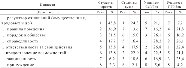 Таблица 1. Характеристика ценностного отношения к праву студентов и учащихся профессиональных учебных заведений