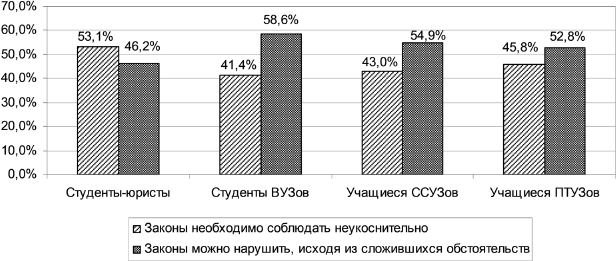 Определенная часть студентов ССУЗов также считает возможным нарушить закон при особых обстоятельствах – 54,9 %, считают выполнение его предписаний обязательными в любом случае 43,0 %. Среди учащихся ПТУЗов придерживаются позиции о возможности нарушения норм закона, исходя из особых обстоятельств 52,8 %. На позиции неукоснительного соблюдения норм закона стоят 45,8 % респондентов.
