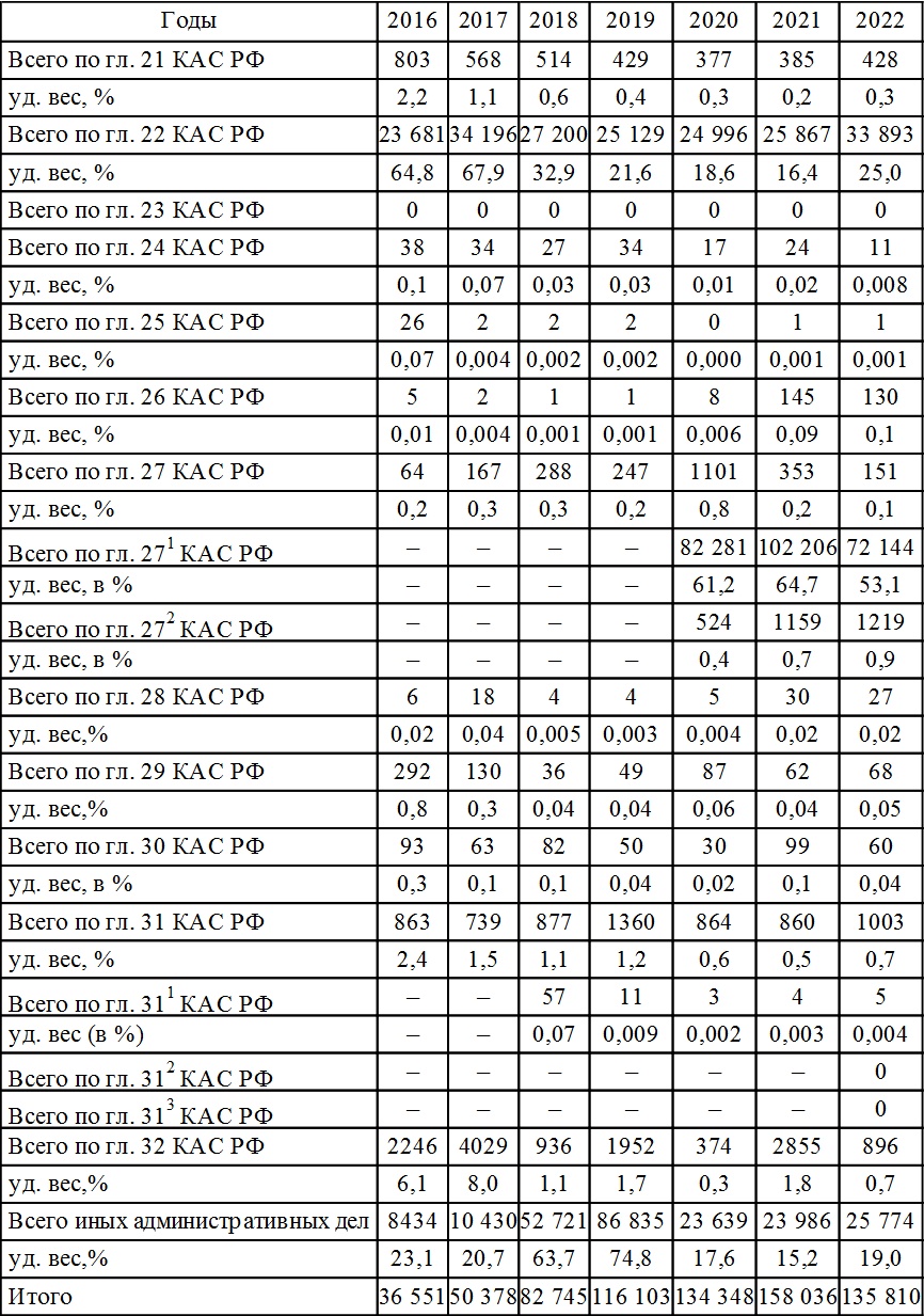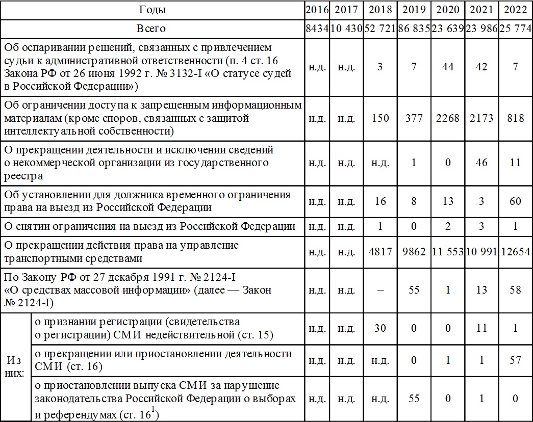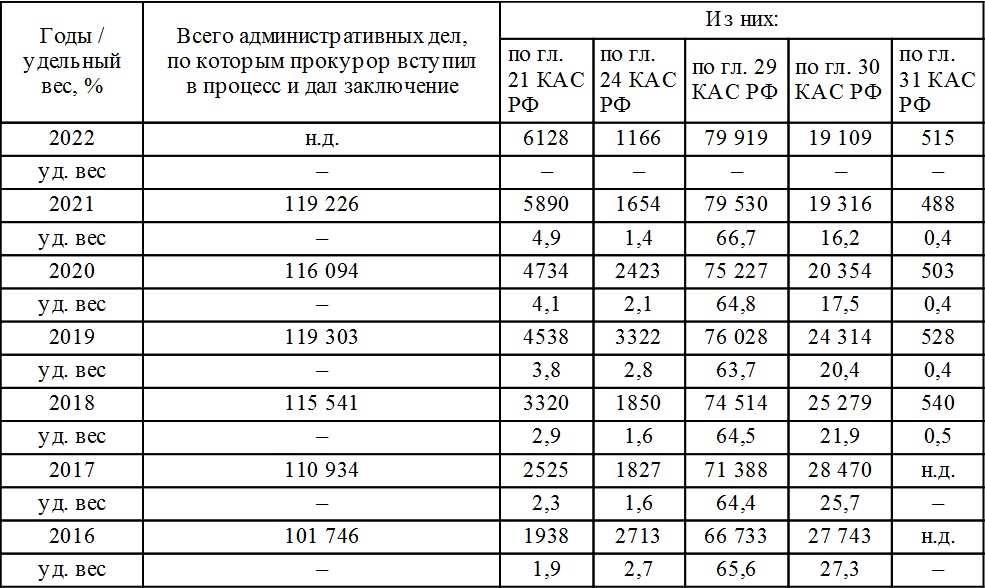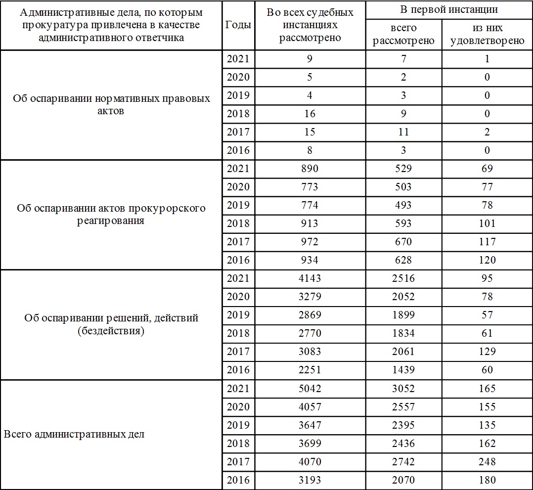 Между тем ведомственный статистический отчет прокуратуры по форме ЗИП ГАС отображал данные по соответствующим показателям в административном процессе только в 2016–2021 гг. (табл. 1.3.7)108.