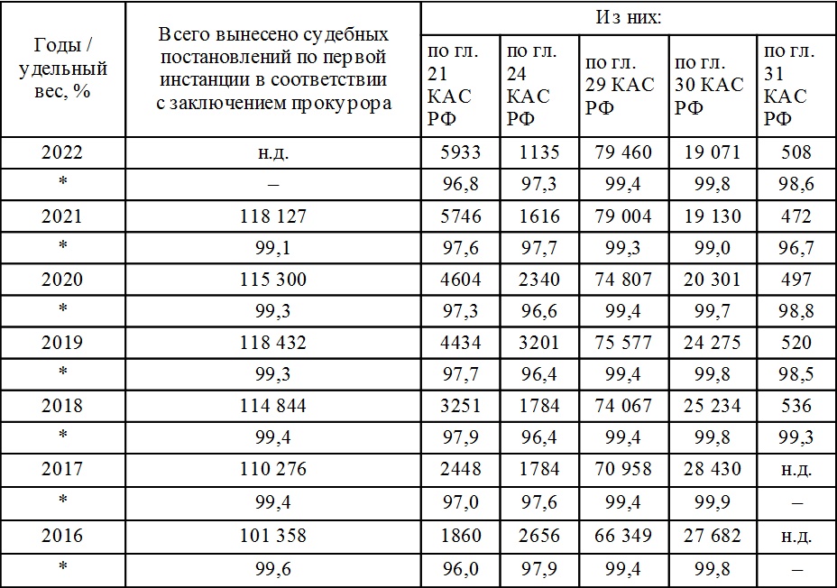 При этом сохраняется высоким процент судебных постановлений, принятых по первой инстанции в соответствии с позицией прокурора, – в среднем за шесть лет этот показатель составил почти 99,4% (табл. 1.3.4)103.