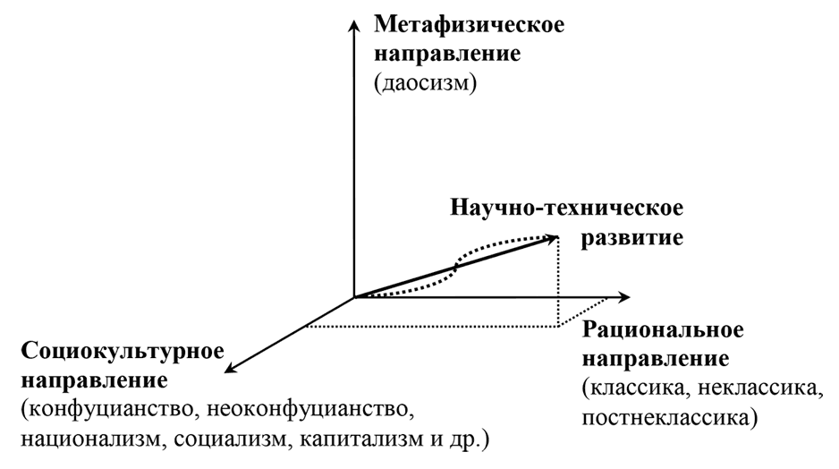 Представляется, что при философско-методологических оснований анализа научно-технического развития Китая, необходимо синтезировать в единую модель наиболее существенные, но односторонние «срезы» процесса научно-технического развития.