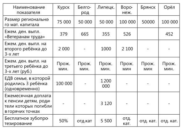 В Брянской области выплачивается единовременное пособие в размере 2 тыс. рублей при рождении третьего и последующих детей. В Воронежской области единовременная губернаторская выплата составляет 20 тыс. рублей вне зависимости от того, родился ли первый, второй или третий ребёнок в семье. В Курской области выплачиваются ежемесячные дополнительные пособия на каждого родившегося второго и третьего ребёнка до 3 лет, в размере 2 и 3 тысячи рублей соответственно. В Липецкой области выплачивают региональное единовременное пособие только при рождении третьего ребёнка и последующих детей, которое составляет на 2013 год – 50 тыс. рублей. В Московской области выплачивают при рождении второго ребёнка единовременное пособие в размере 2 тыс. рублей, а третьего и последующих детей – 10 тыс. рублей. Если родилась двойня, то в этом случае сумма пособия возрастает до 20 тыс. рублей, трёх и более детей – до 50 тыс. рублей. Конечно, это серьёзная помощь семье со стороны региональных властей и она направлена не только на укрепление института семьи и укрепление здоровья подрастающего поколения, но и прямо или косвенно работает на авторитет региональной власти.