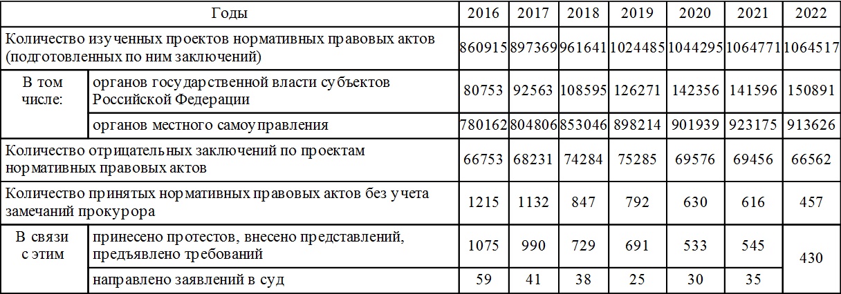 Действительно, некоторые нормативные правовые акты принимаются без учета замечаний прокурора, участвовавшего в правотворческой деятельности. Например137, в 2022 г. 0,7 % нормативных правовых актов принято без учета замечаний прокурора по соответствующим проектам (для сравнения в 2020–2021 гг. – 0,9 %; в 2018–2019 гг. – 1,1 %; в 2017 г. – 1,7 %; в 2016 г. – 1,8 %) (подробнее в табл. 2.1.1)138.