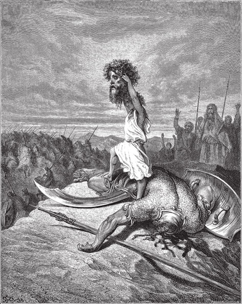 ДАВИД, ПОБЕДИВШИЙ ГОЛИАФА. ПЕРВАЯ КНИГА ЦАРСТВ, ГЛ. 17, СТ. 51. Тогда Давид подбежал и, наступив на Филистимлянина, взял меч его и вынул его из ножен, ударил его и отсек им голову его.