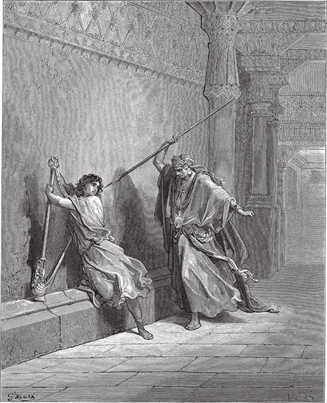 САУЛ И ДАВИД. ПЕРВАЯ КНИГА ЦАРСТВ, ГЛ. 19, СТ. 10. И хотел Саул пригвоздить Давида копьем к стене, но Давид отскочил от Саула, и копье вонзилось в стену.