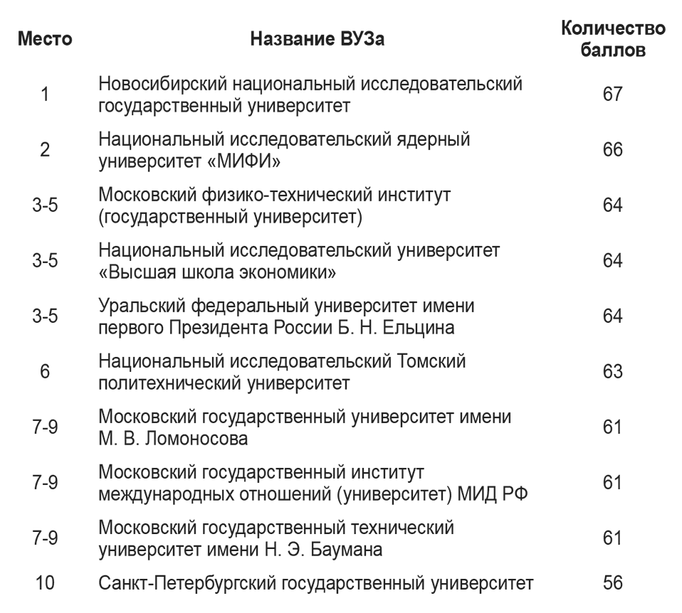 Методика анализа сайта вуза, предложенная Д. А. Шевченко, дает более полную картину оценки эффективности сайта вуза, она опирается на следующую гипотезу: предложения вуза, выраженные на сайте в форме контента, дизайна, навигации, интерактивности (обратной связи), видимости его в Интернете, являются критериями оценки его качества, которое способствует повышению конкурентоспособности вуза на рынке образовательных услуг. Согласно данной методике, оценка эффективности сайтов базируется на следующих критериях, каждый из которых, в свою очередь, включает ряд присущих ему параметров: дизайн[82], навигация[83], контент[84], интерактивность[85], видимость сайта в Интернете[86]. Максимальное число баллов, которое можно получить – 72. Таким образом, используя методику Д. А. Шевченко, в ходе исследования сайтов десяти лидеров высшего образования в России в декабре 2016 г., были получены данные, которые позволили сформировать следующий рейтинг: