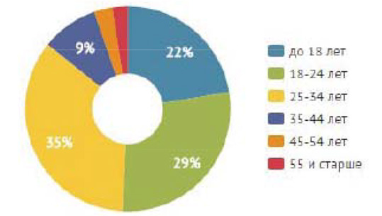 Рисунок 2. Распределение аудитории VK.com в соотвтетствии с возрастом (данные на ноябрь 2016 г.)