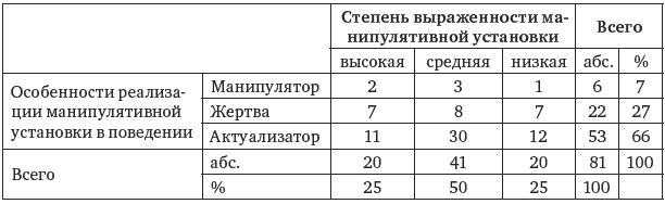 Самой распространенной является группа со средней степенью выраженности манипулятивной установки. Однако и эта группа смешана по своему составу, в ней присутствуют испытуемые, которые оцениваются сверстниками как «манипуляторы», «жертвы» и «актуализаторы». Таким образом, можно сделать вывод о разнородности манипулятивного поведения в период взросления, о зависимости его от многочисленных предпосылок, а также о том, что высокая, средняя или низкая выраженность у субъекта готовности манипулировать другими людьми реально может проявлять себя как в манипулятивном, так в жертвенном и в актуализационном поведении.