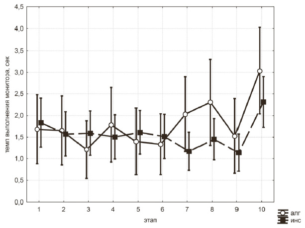 Рис. 1. Динамика загрузки рабочей памяти при решении алгоритмизируемой и инсайтной задачи