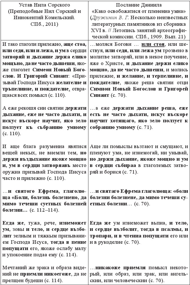 Рассуждения митрополита о чтении Иисусовой молитвы имеют прямую связь с Уставом Нила Сорского. Можно допустить, что причина этого кроется в использовании авторами одних и тех же источников – «Лествицы», творений Симеона Нового Богослова и Григория Синаита. Однако сопоставление послания «Како освобожатися от пленениа умна» с текстом второй главы Устава свидетельствует о текстуальной зависимости сочинения Даниила от труда Нила Сорского даже при цитировании святых отцов. Это говорит о том, что Даниил не только обращался к Уставу (список которого находился в Волоколамском монастыре и был ему доступен274), но и заимствовал из него ключевые фрагменты: