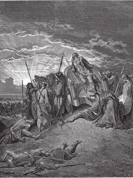 СМЕРТЬ АХАВА. ТРЕТЬЯ КНИГА ЦАРСТВ, ГЛ. 22, СТ. 34–35. А один человек случайно натянул лук и ранил царя Израильского сквозь швы лат… Царь стоял на колеснице против Сириян, и вечером умер, и кровь из раны лилась в колесницу.
