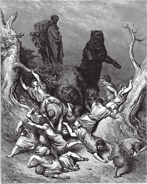 ЕЛИСЕЙ ПРОКЛИНАЕТ ЗЛЫХ ДЕТЕЙ. ЧЕТВЕРТАЯ КНИГА ЦАРСТВ, ГЛ. 2, СТ. 24. Он оглянулся и увидел их и проклял их именем Господним. И вышли две медведицы из леса и растерзали из них сорок два ребенка.