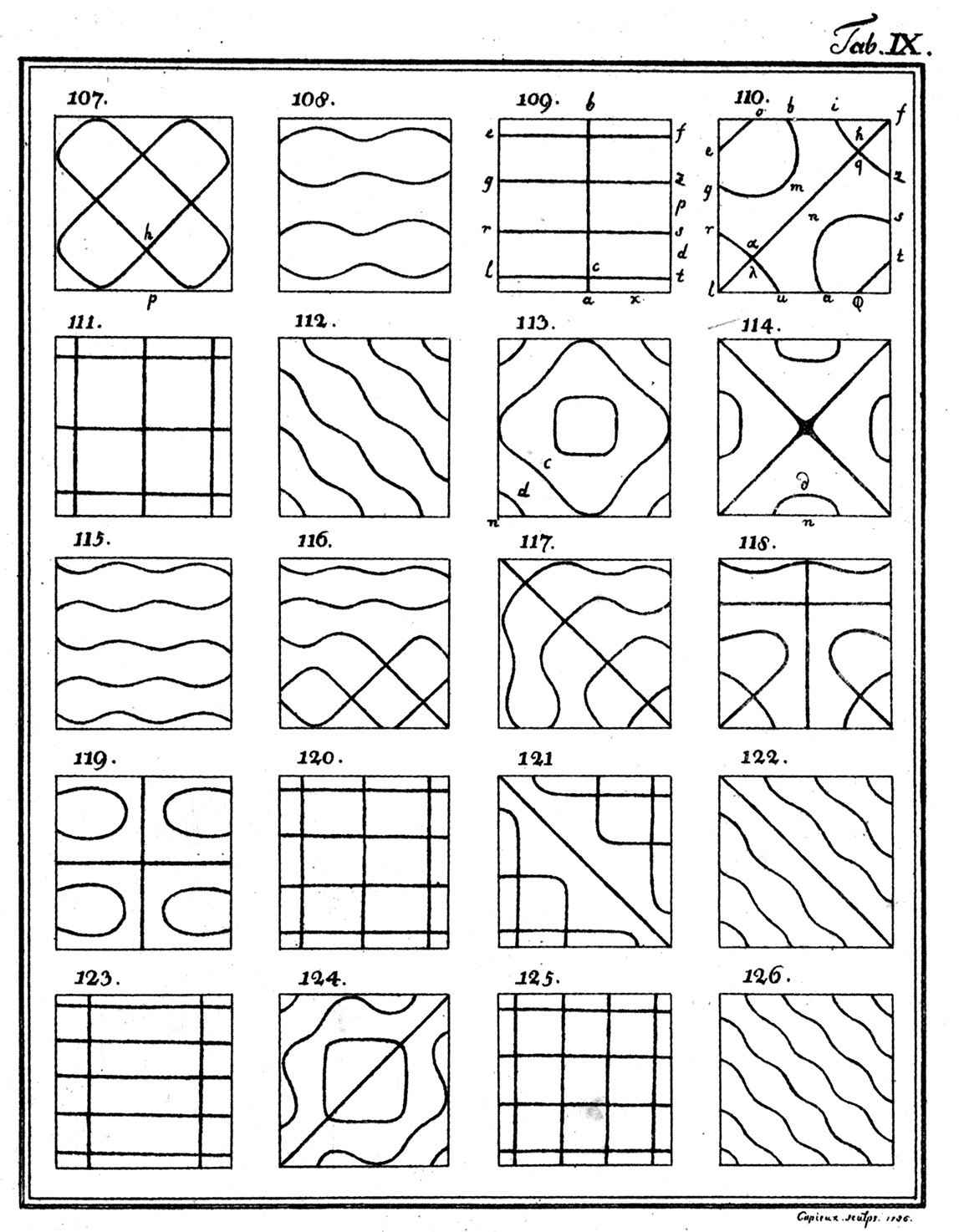 Ил. 2. Качающиеся движения прямоугольного диска (Фигуры Хладни). 1787. Entdeckungen über die Theorie des Klanges. Leipzig, Tafel IX