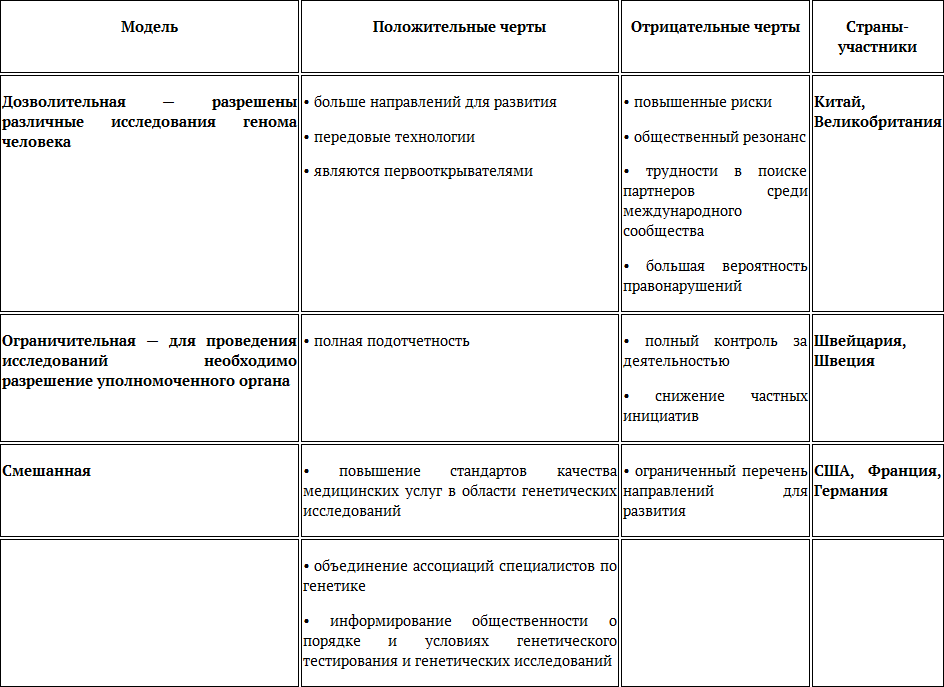 Подводя итоги, целесообразно отметить, что на сегодняшний день в общемировом масштабе дифференцируются следующие модели правового регулирования генетических технологий в сфере медицины (виды национальных режимов развития генетических технологий): дозволительная, ограничительная и смешанная. Первая модель характеризуется открытостью к нововведениям, стремлением к изучению новых направлений деятельности и высоким уровнем исследовательских инициатив, поддерживаемых государством, в связи с чем ее следует обозначить как «дозволительная/разрешительная» модель. Данной модели присущи такие положительные черты, как: широкий выбор направлений для развития, использование, изучение и разработка передовых технологий, лидирующие позиции по данному направлению развития на международной арене. При этом освоение новых направлений в сфере генетических технологий влечет за собой появление отрицательных черт (рисков), а именно: в результате выхода за рамки общепризнанных границ развития страны сталкиваются с проблемой трудности выбора партнера среди международного сообщества для некоторых направлений сотрудничества, поскольку во многих странах установлен мораторий на соответствующую деятельность. Кроме того, поскольку проводимые исследования напрямую связаны с правами и свободами человека, развитие генетических технологий сталкивается с этическими требованиями и зачастую вызывает общественный резонанс, предполагает усиление защиты информации, получаемой в рамках таких исследований, с целью недопущения ее злоупотреблением. Данная модель характерна для таких стран, как Китай, Великобритания.