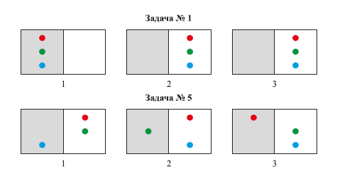 С помощью данного устройства испытуемому предъявлялись диагностические задачи-головоломки. Каждая задача представляла собой определенное распределение точек разного цвета на трех полосках бумаги, разделенных на два сектора. Расположение точек в правом секторе соответствовало нормальному их положению, а в левом – отклонению. Предъявляемое распределение точек было получено ранее экспериментатором на данном устройстве при проставлении точек по определенной программе и при смещении одного или двух его элементов. Задача испытуемого заключалась в нахождении смещенных элементов устройства по предъявленному расположению точек (рис. 1).