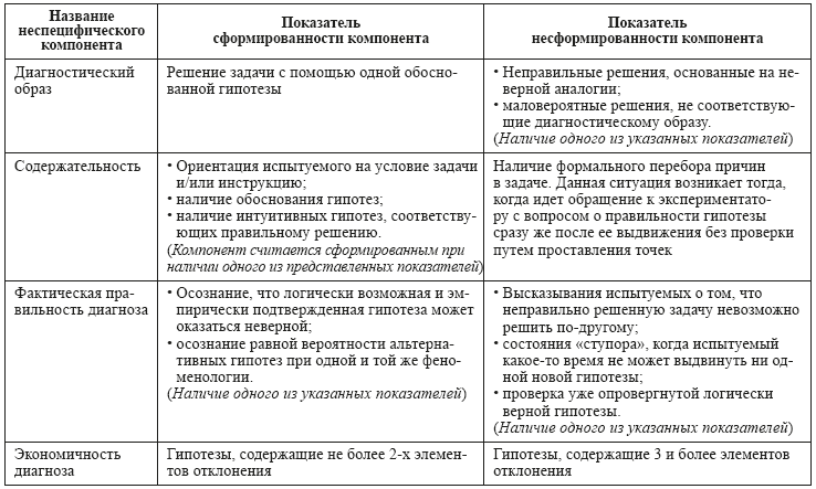 2. Эмпирические индикаторы сформированности неспецифических компонентов диагностического поиска (табл. 1):