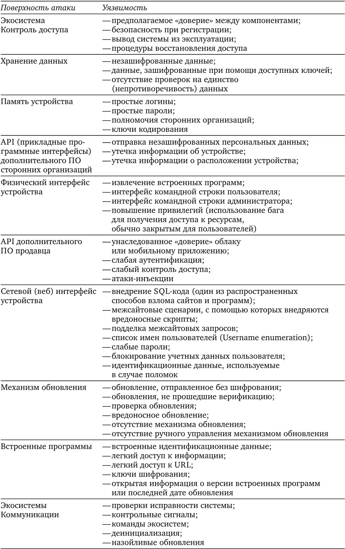 Сложная система взаимозависимостей в сетях интернета вещей приводит к тому, что IoT имеет большую поверхность, открытую кибератакам, и многочисленные уязвимые места (примеры см. в таблице 1). Чтобы продемонстрировать степень уязвимости интернета вещей, провокативный проект Insecam.org предоставляет доступ к видео тысяч небезопасных «камер безопасности» городов по всему миру, доступных в публичном интернете[241]. Эти камеры можно отключить без возможности дистанционного включения[242]. Другие исследователи показали, как взломать и взять под свой контроль системы «умного» освещения, создав этим потенциальную угрозу для личной безопасности горожан[243]. Наконец, инфраструктура интернета вещей может быть использована для совершения кибератак другого рода, как, например, случилось с Dyn (американская компания, предоставляющая сетевые сервисы. – Е. Л.-К.). Атака на нее осенью 2016 года привела к тому, что работа многих важных интернет-сайтов была нарушена из‐за Mirai (червь и ботнет), который захватил небезопасные устройства интернета вещей и использовал их, чтобы бомбардировать серверы Dyn[244].