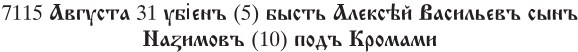 О гибели в этой битве Алексея Васильева сына Назимова сообщает эпитафия на намогильной плите-вставке в пещерном некрополе Псково-Печерского монастыря. Её текст был опубликован архим. Аполлосом (Беляевым) по собственной копии гражданским шрифтом в 1893 г.308 и затем повторён в «Русском провинциальном некрополе» В. В. Шереметевского309. В ХХ в. плита была утрачена.