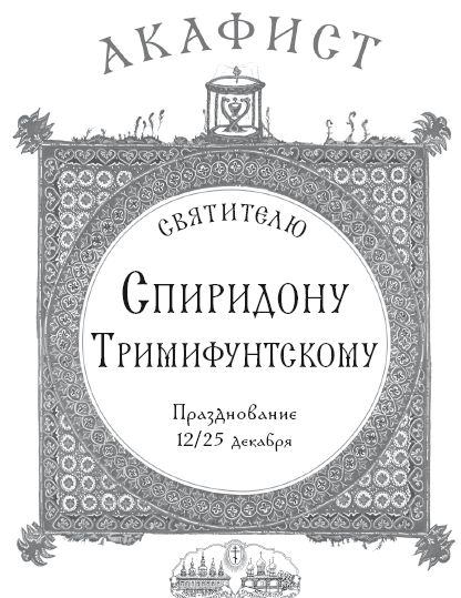 Препросла́вленный от Го́спода святи́телю и чудотво́рче Спиридо́не! Ны́не всечестну́ю па́мять твою́ пра́зднующе, я́ко мно́го могу́щему споспе́шествовати нам о просла́вльшем тя Христе́, уми́льно вопие́м ти: изба́ви нас от вся́ких бед и зол, да с благодаре́нием зове́м ти: Ра́дуйся, Спиридо́не, преди́вный чудотво́рче!