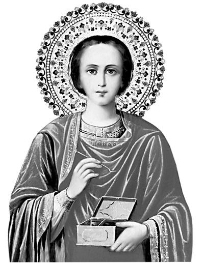 Икос 1А́нгела земна́го и небе́снаго челове́ка ве́мы тя, сла́вный Пантелеи́моне: а́нгельскою бо непоро́чностию и му́ченичеством украше́н, пресели́лся еси́ от земли́ на Не́бо, иде́же со А́нгелы и все́ми святы́ми предстоя́ Престо́лу Го́спода сла́вы, моли́ся о нас, земны́х, почита́ющих тя зва́нии си́ми: