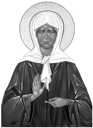 Ра́дуйся, пра́ведная ма́ти Матро́но, те́плая о нас к Бо́гу моли́твеннице.