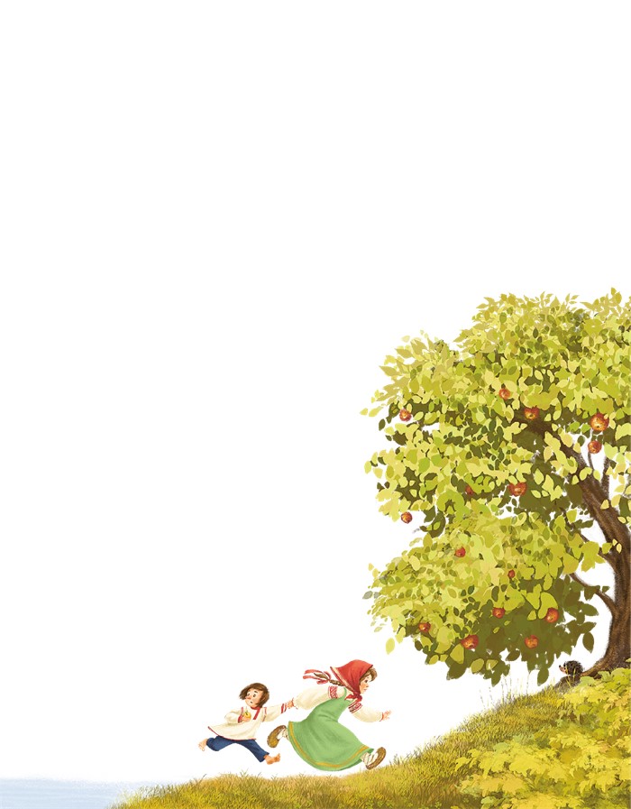 Нечего девочке делать – съела. Речка посадила сестру с братом под бережок, гуси пролетели, не заметили. Вышла девочка, поблагодарила речку и дальше с братцем побежала. А гуси-лебеди воротились и летят им навстречу. Что делать? Беда! Стоит яблоня.