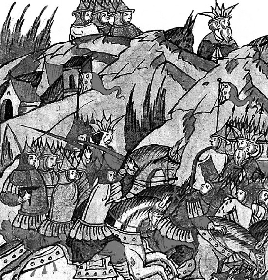 Победа Тамерлана над ханом Тохтамышем. Миниатюра Лицевого летописного свода. XVI в.
