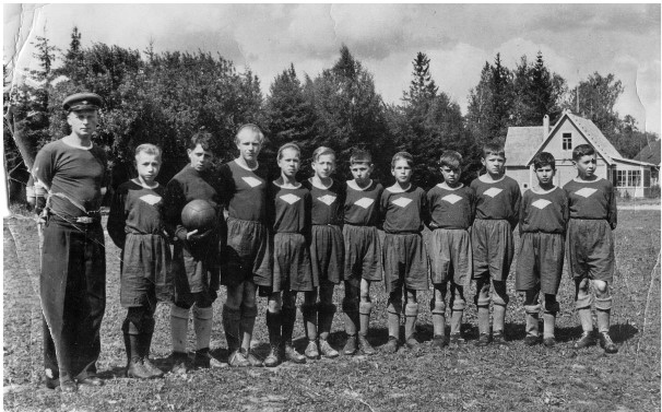 Детская футбольная команда Курортного района Ленинграда. Крайний справа – Э. Серебренников. Вторая половина 1940-х