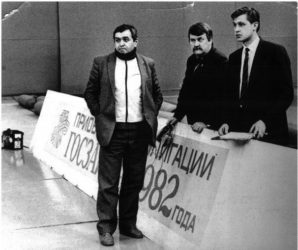Слева направо: Режиссер телетрансляций Эрнест Серебренников, оператор Юрий Пендер и журналист Кирилл Набутов. Начало 1980-х