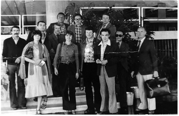 Группа ленинградских спортивных журналистов на Олимпийских играх 1980 г. в Москве. Э. Серебренников – второй слева во втором ряду