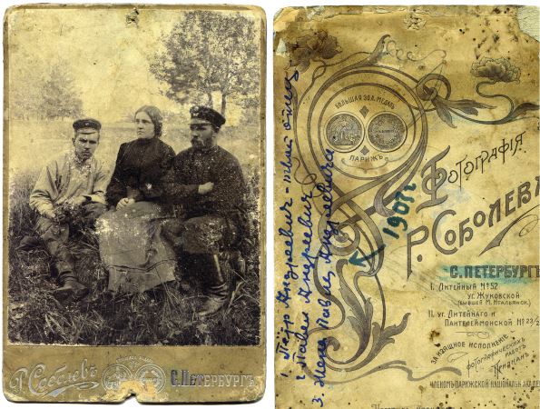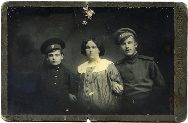 На фотографии 1903 года – с братом и его женой повзрослевший Петр Чуров перед выпуском из училища в светлой летней блузе, в суконной фуражке с той же эмблемой и заправленных в сапоги серых шароварах.