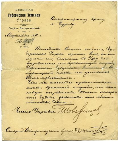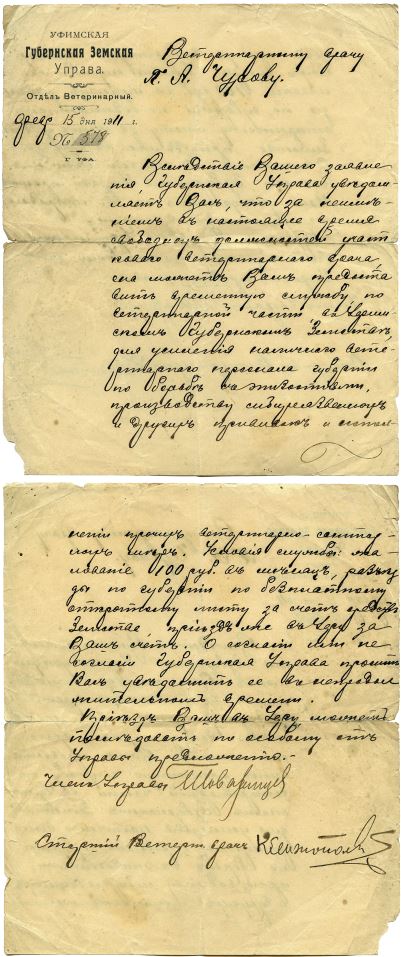 Ответив согласием, 10 марта 1911 года П. А. Чуров получил из губернской управы конкретное указание о дальнейшем порядке своих действий: «Выехать в Уфу для определения на временную службу Уфимского Губернского Земства по ветеринарной части на условиях Вам известных».