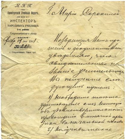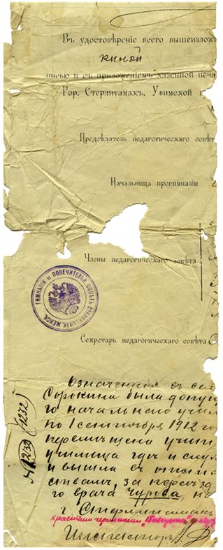 Фрагменты свидетельства об окончании М. Сорокиной Стерлитамакской прогимназии, 1910 г.