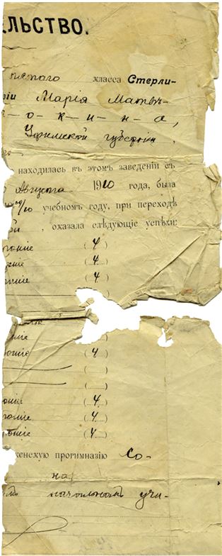 Сохранившиеся фрагменты выпускного свидетельства говорят о том, что училась Мария без блеска, но вполне прилично. Это позволило ей стать учительницей начальных классов.