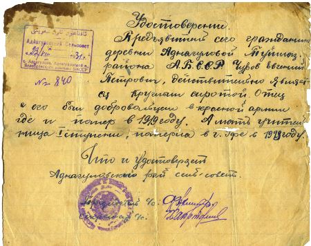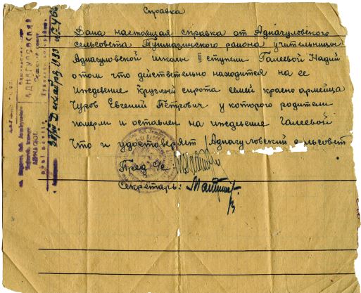 Справка о сиротстве Е. П. Чурова, 1931 г.