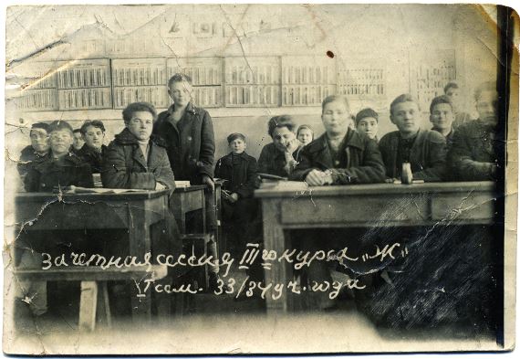 Евгений Чуров (второй справа в первом ряду) среди учащихся Аксеновского сельхозтехникума, 10 января 1934 г.