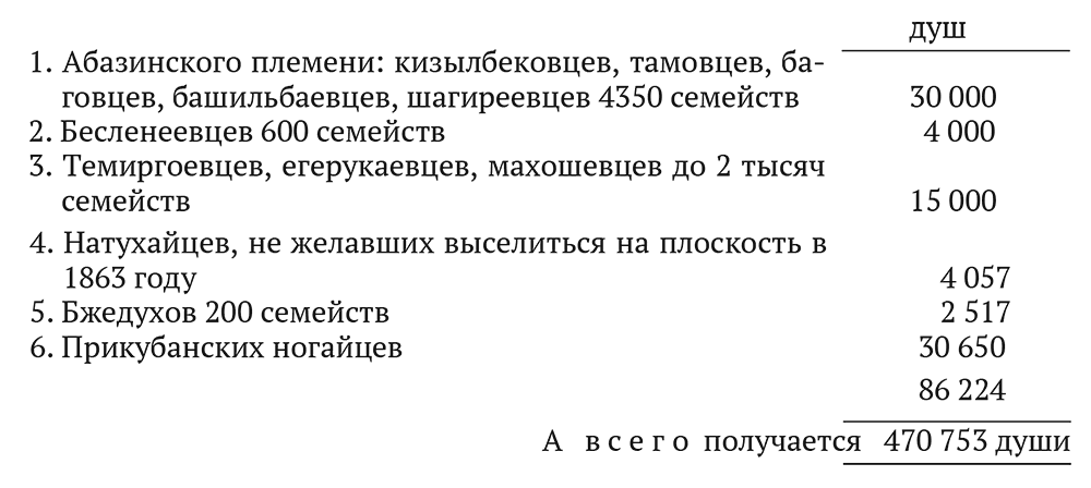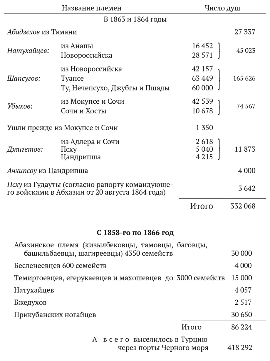 К сожалению, мы не имеем данных определить хотя бы с достаточною приблизительностью численность каждого из племен, так как при совершенном отсутствии между ними государственности сами представители их и старшины никогда не знали точной цифры своих единоплеменников. Даже число дымов, при полной свободе каждого жить и уходить куда ему угодно, не могло быть определено. Если бы выселение производилось систематически и под надзором нашего правительства, то была бы возможность определить численность каждого из племен, ушедших в Турцию, но дело в том, что выселение началось ранее появления наших войск на южном склоне Кавказа у берега Черного моря. Горцы грузились на турецкие кочермы, выходившие из пунктов, принадлежащих еще непокорным племенам, которым решительно не было никакого интереса считать, кто и зачем отправляется в Турцию. С другой стороны, при усилившемся выселении, когда наше правительство было вынуждено принять непосредственное участие в этом событии для устранения бедственного положения горцев, столпившихся массами на берегу Черного моря в ожидании прихода судов и без всяких средств к существованию, счет переселенцев производился не с научной, а с гуманной целью уменьшить размер бедствий переселенцев. Оттого в официальных документах более всего обращалось внимание на счетоводство, на количество выданных пособий, причем этнографические особенности остались в стороне. Сколько тысяч горцев было отправлено на частных, казенных и турецких судах – определить можно; но кто именно отправлялся: бжедухи, абадзехи или шапсуги – оказывалось известным только в редких случаях. Вот почему мы, исчисляя отдельные племена, не выставили в прилагаемой ниже ведомости ни числа дымов, ни числа душ в каждом из них, так как такие цифры были бы совершенно неточны. Мы могли составить эту ведомость по официальным документам, из которых видно, что число всех переселенцев в Турцию через порты восточного берега Черного моря с 1858-го по 1865 год составляет 469 703 души. Из них приблизительно главных племен выселилось:
